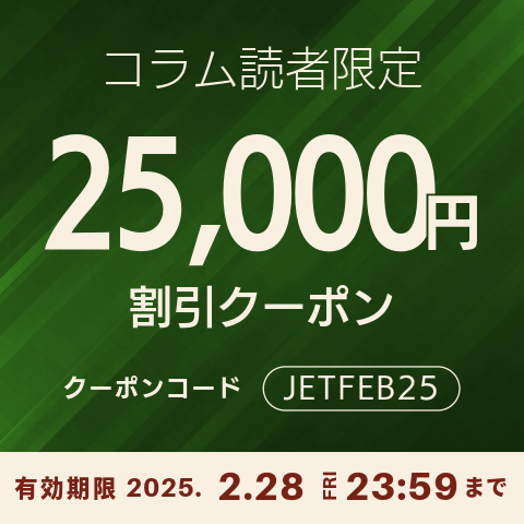 クレジットカードによる購入ページ に移動し、小計の下に表示されている "プロモーションコードを追加 (または、コードを追加)" の欄に「JETFEB25」と入力してください。